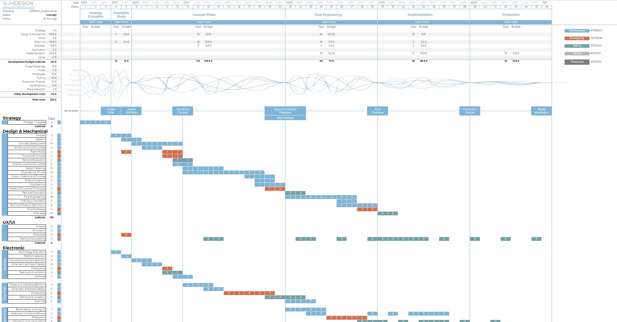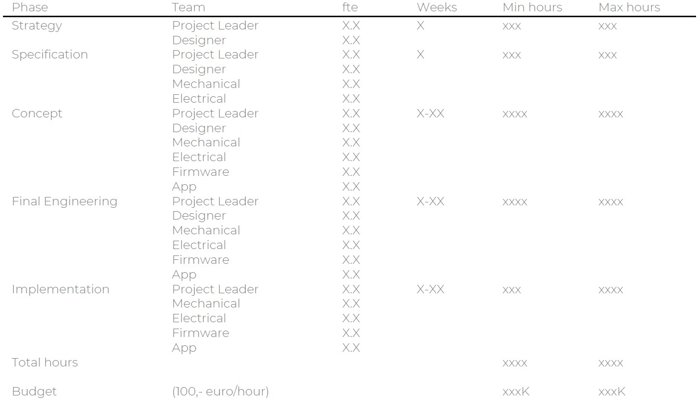 For this project, we assembled a team of four people. The product designer did the strategy and analysis, and the Mechanical + Electrical Engineers worked together to translate the requirements into a component selection, volume configurations, and cost price. The project manager supervised the activities and created the planning and budget indication.