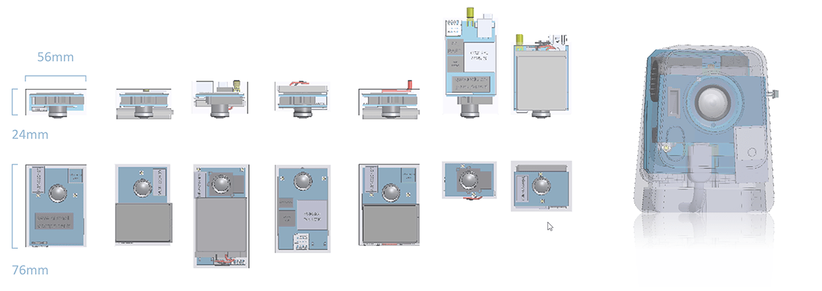 To get an indication of the volume, we create different component configurations. This is a combined effort from both the electronic and mechanical engineers. Some sample configuration questions may be: Which components need to be close together and on the same PCB, where will the heat be dissipated, where do we position the antennas, which lens will we use, etc. The different options are modeled in 3D CAD and visualized so that they can be discussed in the team.